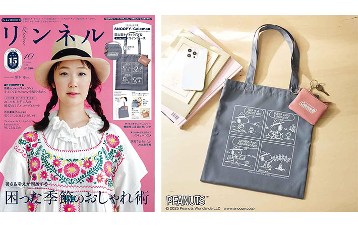 同時発売の『リンネル』2025年10月号増刊付録は『スヌーピー×コールマン 両A面トートバッグ&キーチェーン付きコインケース』。こちらもかわいい!