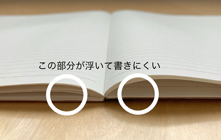 一般的なノートは、開くと用紙が浮いている部分があり、筆者はこの部分を字が書きにくい苦手ポジションだと思っています。