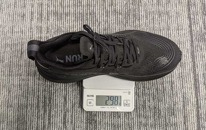 重量は27cmの片足で298gほど。ランニングシューズとしては平均よりも少し重いくらいなので、シビアにタイムを求めていなければ特に気になることはありません。