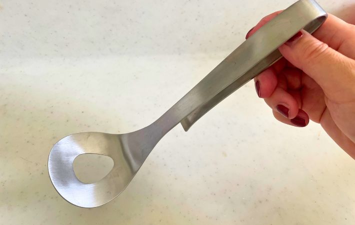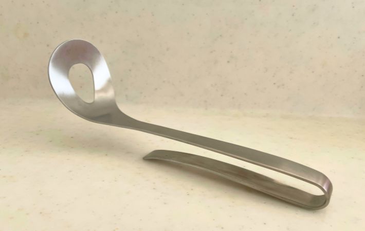 スプーンのように自然に握れる形状で、ステンレス製ながら軽く扱えます。