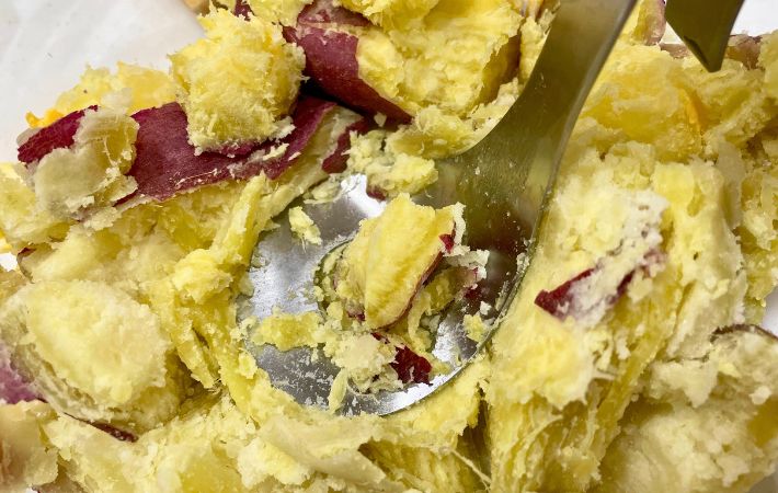 今回は丸ごとのさつまいもをつぶしてみたのですが、先端の穴からホロホロと繊維が出るようにつぶれていくのが印象的でした。