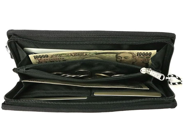 開け口はファスナー仕様になっており、内側はお札用のポケットが2つ、カードポケットが8つ、小銭用ファスナーポケットが1つ装備されています。