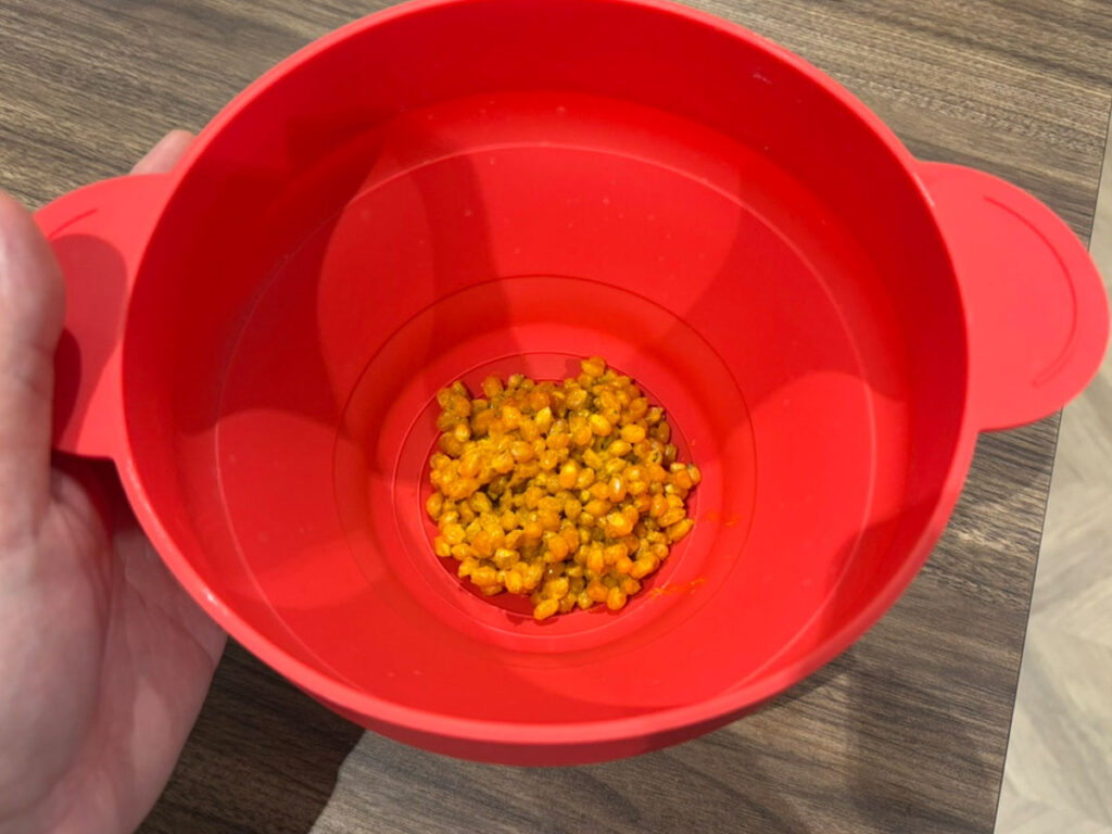 容器を広げて、あらかじめ味つけされたポップコーンの豆を投入。