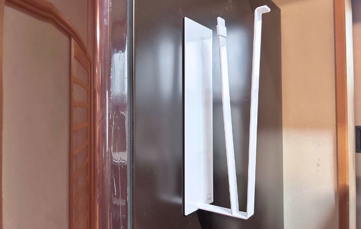 『片手でカットマグネットキッチンペーパーホルダー』を冷蔵庫横に縦向きで設置して、キッチンペーパーを差し込んでみました。