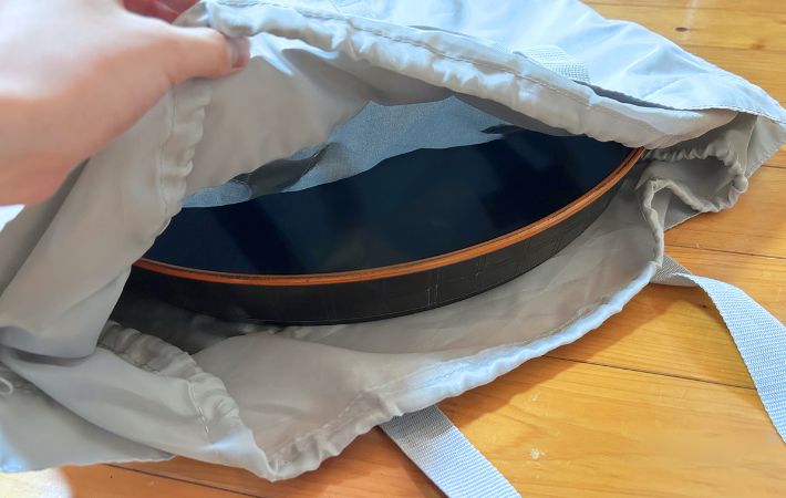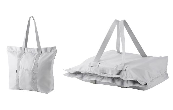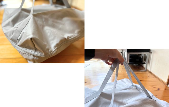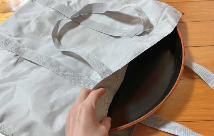 このバッグは幅のある容器を平らな状態で持ち運べるように、絶妙な場所に持ち手が配置されています。