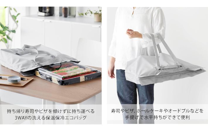 商品名の通り、持ち帰り寿司やピザを傾けず、キレイな状態で持ち帰れるというバッグ。