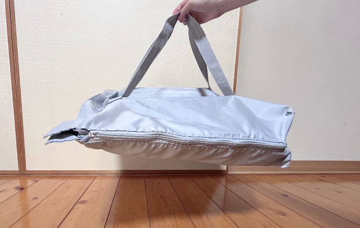 持ち手が長めだから肩掛けスタイルで持ち運べるのもGOOD。腕への負担が少なく、ラクに運べます。