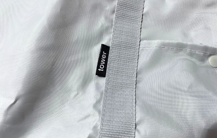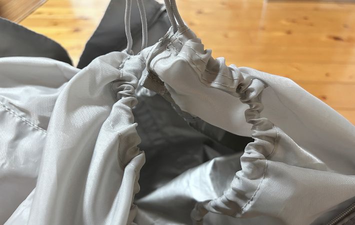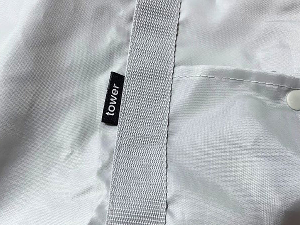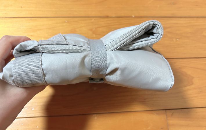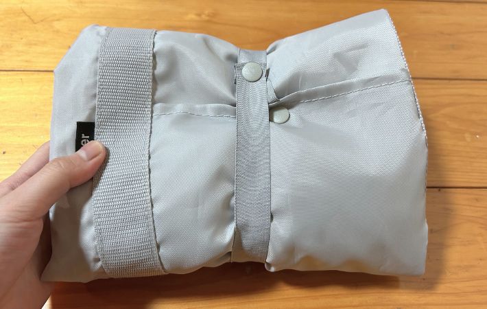 使わない時はポケットから出ているこの紐を使ってコンパクトに折り畳み、持ち運ぶことが可能。