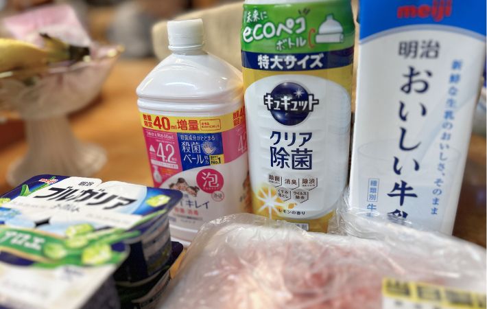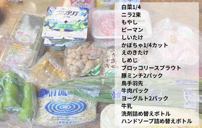 今回は野菜やお肉、乳製品、洗剤など、少し重めでかさばる食材を中心に購入。