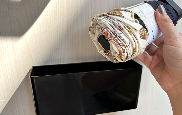 ただ、平たくて幅の太い形の折り畳み傘は入らないことがあるので要注意。細めのものや丸い形のものならスムーズに収まります。