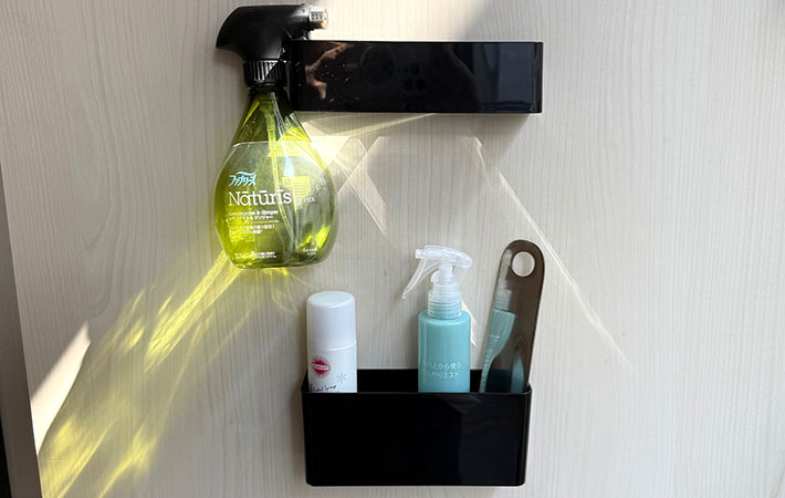 玄関ドアなど壁面にマグネットで貼りつけて使うので、床置きの必要がなく玄関がスッキリ整います!