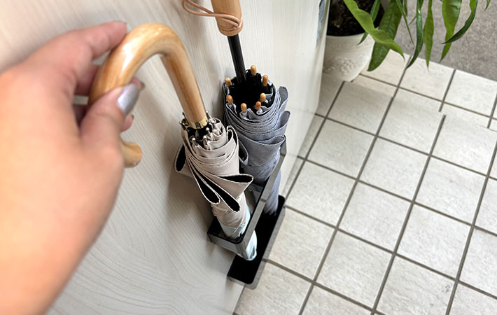 玄関に傘立てを置くと、どうしてもスペースをとって邪魔になったり、掃除がしづらくなったり…。ちょっとしたストレスの原因になりがちです。