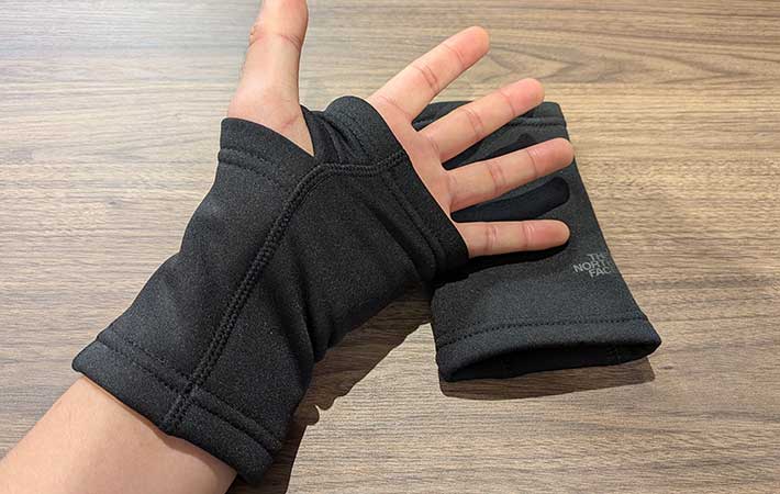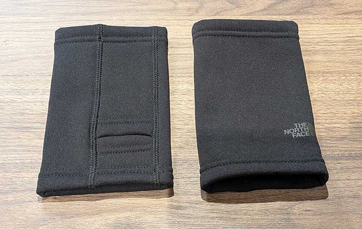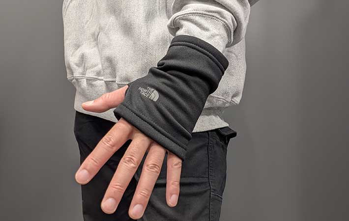 一見ただの筒のようにも見えますが、裏面には親指を通せる穴があいているので、手の甲から手首の少し先まで防寒することができます。