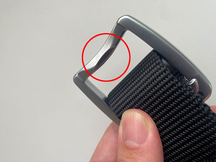 実物の写真がこちら。アルミニウム製の軽量かつ堅牢なバックル、そして頑丈なリサイクルナイロン製のベルト部分が特徴です。