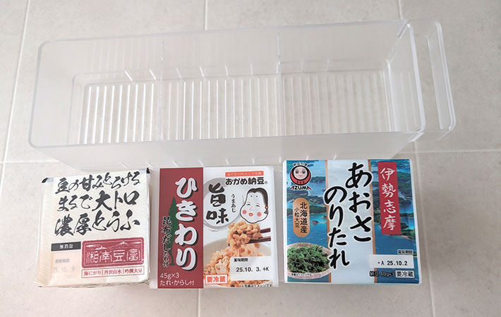 我が家の場合は、納豆をひきわりと粒で分けていますが、豆腐を絹ごし・木綿で分けたり、賞味期限別ごとに整理したりと応用の幅も広いです。