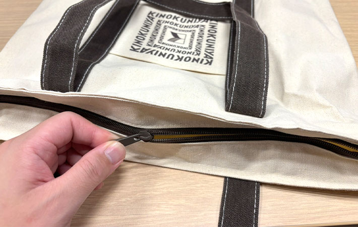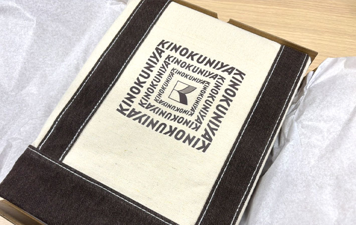 前述のように紀ノ国屋といえばグリーンのイメージがありますが、このトートバッグはブラウンを基調としたデザインで、シックな印象を受けました。