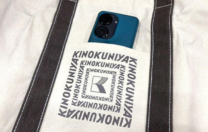 ここからはポケット類を見ていきましょう。前面の紀ノ国屋ロゴがプリントされたポケットは、一般的なサイズのスマホがすっぽり入ります。