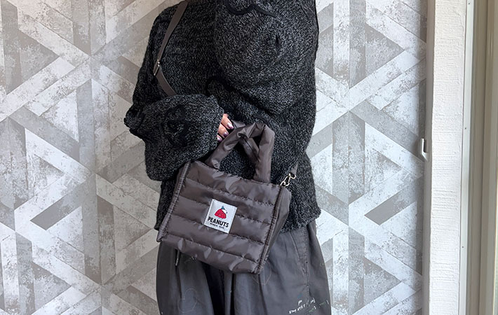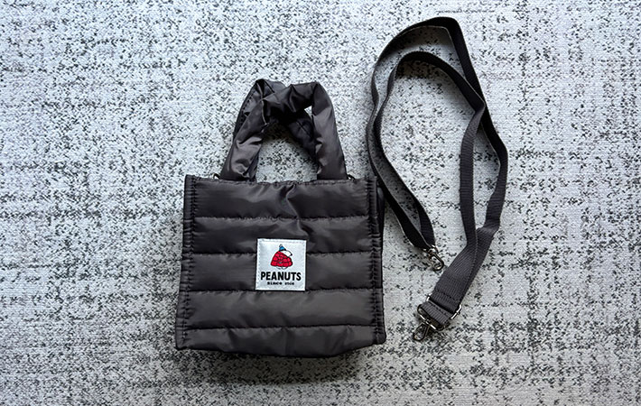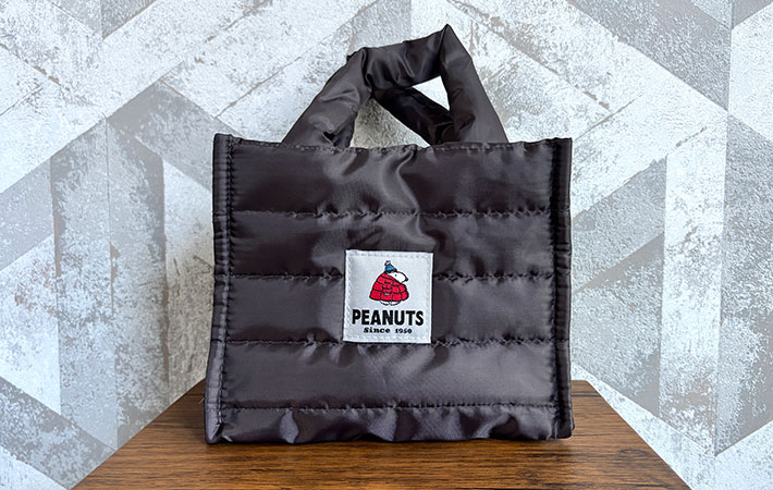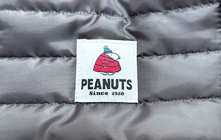 ふっくら柔らかなキルティング素材にもこもこダウンを着たスヌーピーの刺しゅうタグ、そして大人が使いやすい落ち着いたチャコールグレーの色合いが魅力のアイテムです。