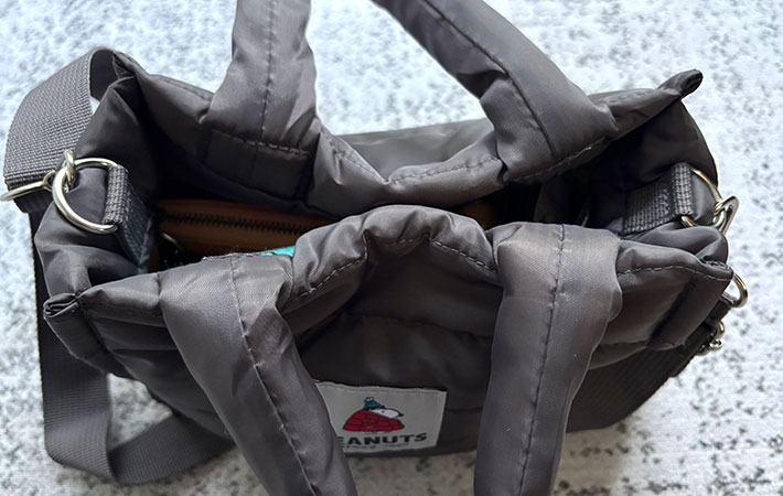 本体は落ち着いたチャコールグレーで、フロントにはスヌーピーの刺しゅうタグが。キャラクター感が控えめで大人っぽい印象です。