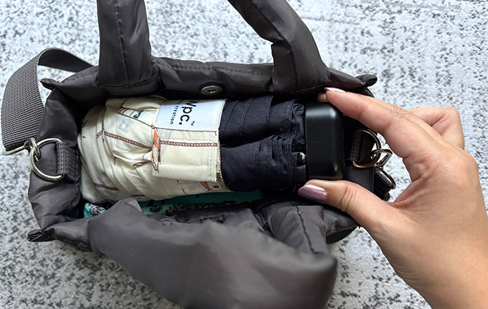 折りたたみ傘を入れるとさすがに口は閉まりませんが、見た目以上の収納力がとても頼もしいです。