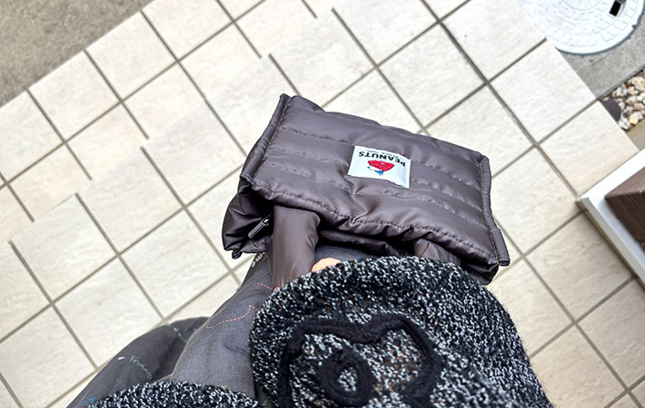 ダウンジャケットを着て少し…いや、だいぶ着ぶくれしたスヌーピーの姿がなんともかわいい!見るたびにほっこりします。