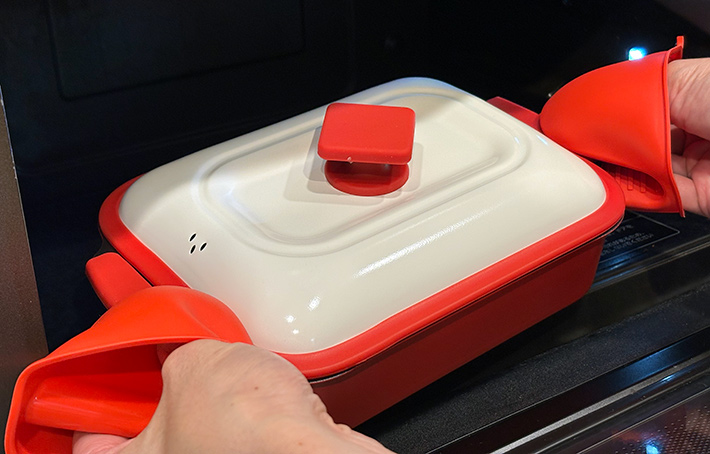 『レンジパン』には、専用のシリコン製ミトンも付属されているので、しっかりと装着して取り出しましょう。