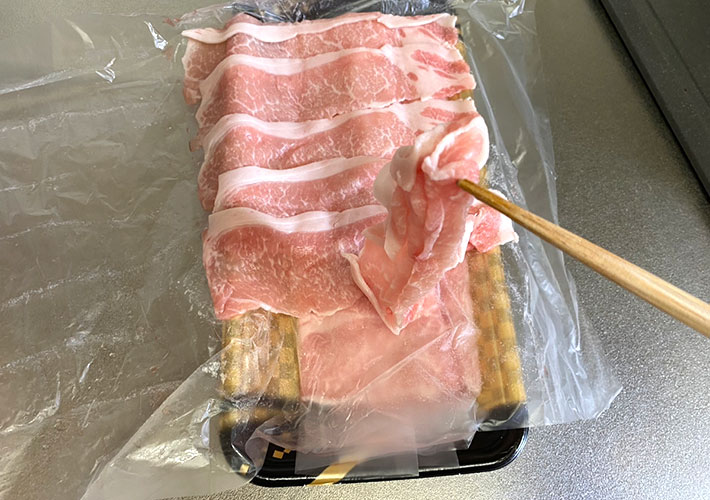また、だいたい肉同士を重ねて畳まれた状態でパックされているので、手で広げながら1枚ずつそーっと箸で外さなきゃいけないのがストレスだったんですよね~。