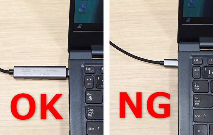 非常に便利な『USB Type-Cケーブルハブ』ですが、1つ注意点があります。それは、パソコンやスマホに接続する時の方向に決まりがあること。