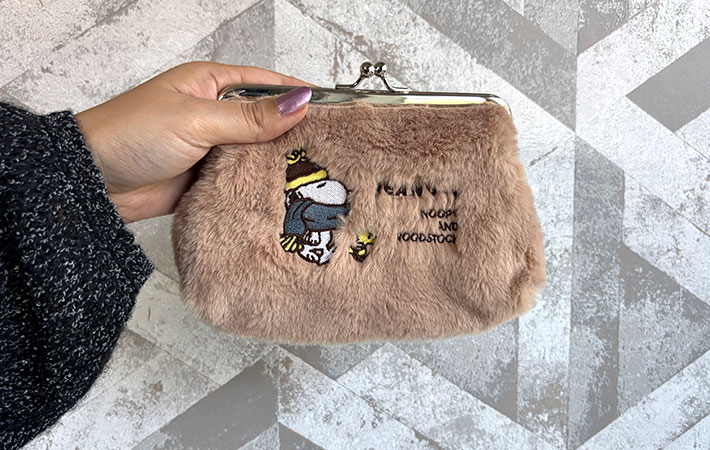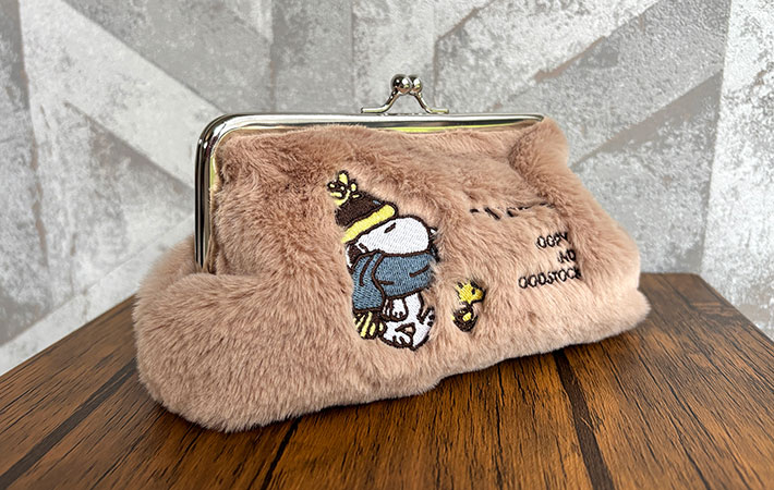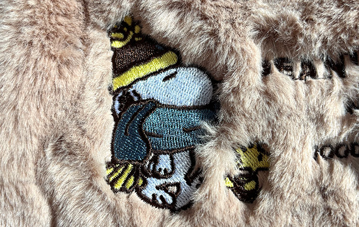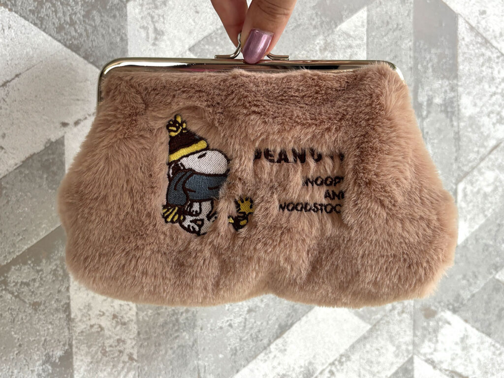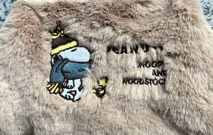 落ち着いたベージュのファーに、スヌーピーの刺繍があしらわれたシンプルかわいいデザインが魅力。
