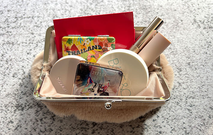 リップやミラー、フェイスパウダーなどのお直し用コスメをまとめて入れるのにぴったり。
