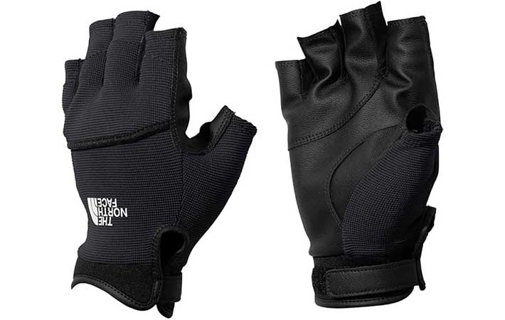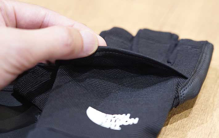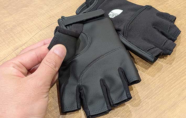 ノースフェイスらしいシンプルなデザインで、表側はストレッチ性を持つメッシュ生地、裏側は耐久性の高い合成皮革を使用。