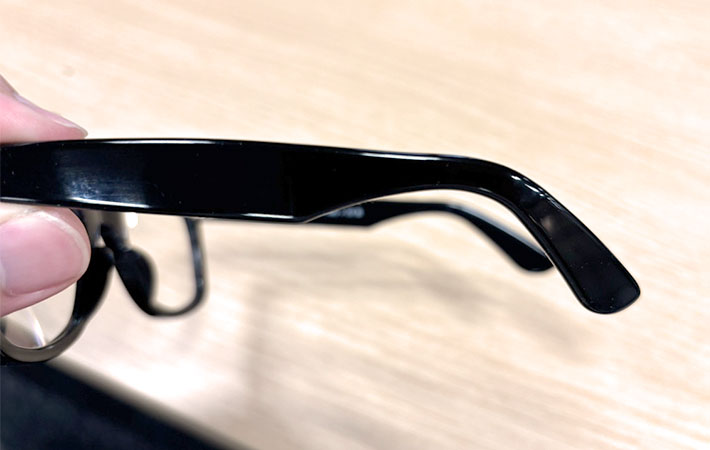 サイドのテンプルもフレームと同様に太めで、先端は耳に合わせた形状に。