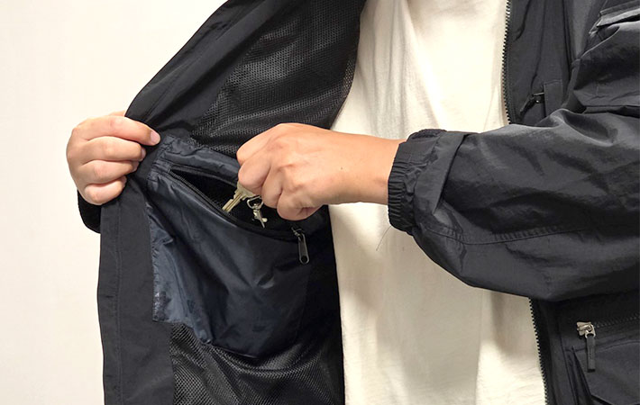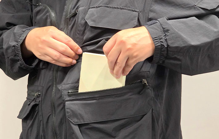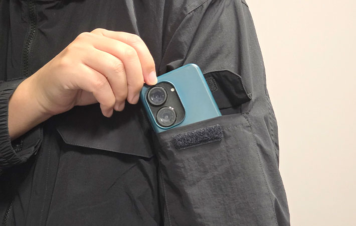 スマホが入る胸ポケットをはじめ、合わせて10個もポケットがついています。