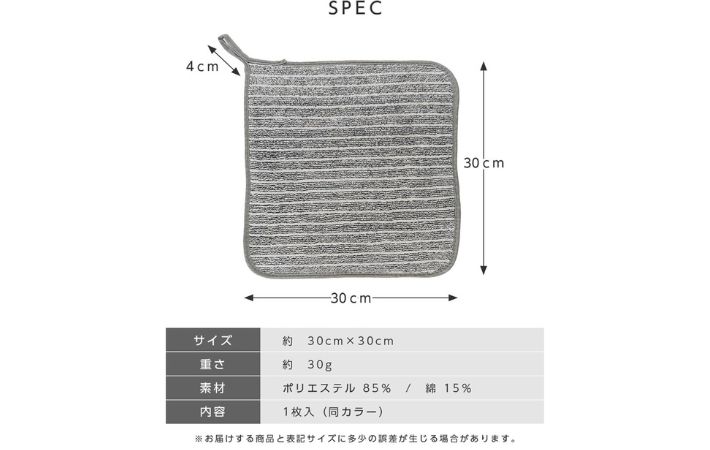 サイズは30cm角で、重さは30gほど。素材はポリエステル85%と綿15%でできています。