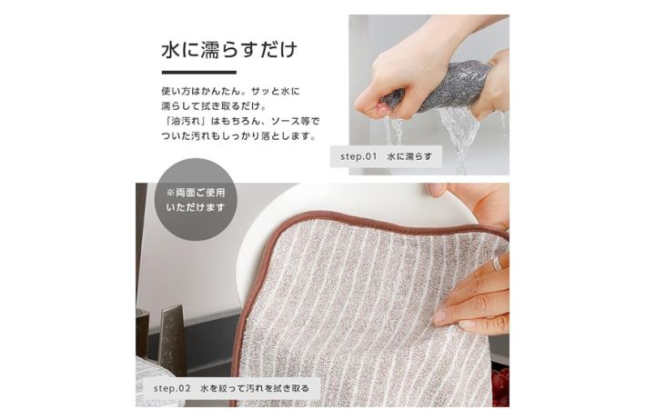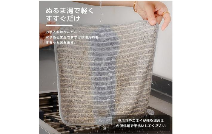 一回使うと「なぜ早く使わなかったんだ」と悔やむレベル! 洗剤を使わず水だけでここまで落ちます ホーム・キッチン By - shio 更新:2025-10-21 ※本記事はUPDATEが独自に制作したコンテンツです。また、本記事を経由して商品の購入が発生した場合に、ECサイト等から送客手数料を受領することがあります。 毎日、キッチンを使っているといつの間にか付着している油などの汚れ。 「後でまとめて拭き取ればいいや」と放っておくと、べたつきやニオイが残って大変なことになります…。 そんな時に頼れるのが『油汚れ クロス』です。 Amazonで『油汚れ キッチンクロス 5枚セット』を見る 楽天市場で『油汚れ キッチンクロス 5枚セット』を見る Yahoo!で『油汚れ キッチンクロス 5枚セット』を見る こちら、ただのキッチンクロスと侮るなかれ! なんと洗浄剤を使わず、水だけで汚れが落ちるという魔法のようなアイテムなんです。 実際に使ってみるとその便利さにびっくり!当記事で毎日の台所仕事がぐっとラクになるその理由を詳しくレビューします。 目次 1. 『油汚れ クロス』の秘密を徹底解説2. 家の気になるあちこちをピカピカにしてみた3. まとめ 『油汚れ クロス』の秘密を徹底解説 サイズは30cm角で、重さは30gほど。素材はポリエステル85%と綿15%でできています。 まずは生地の見た目や質感からチェックしてみましょう。 シンプルなグレーのカラーで、どんなキッチンにもなじむボーダーデザイン。 手に取ると、ふんわり程よい厚みとやわらかさがありながらもしっかりとした織り目を感じ、耐久性に期待できます。 筆者 大きすぎず小さすぎないサイズだから手にフィットする!これはかなり拭きやすそう! このクロスの最大の魅力は、なんといっても水だけで汚れが落ちること。 普段なら洗剤を使わないと落ちにくい油汚れも、サッと濡らして拭くだけでしっかりキレイに落とせます。 筆者 両面まんべんなく使えるのもいいね。 汚れてもぬるま湯で軽くすすげば元通りに。 なかなか落ちない頑固な汚れやニオイが気になる場合は、台所用洗剤で手洗いするといいみたいです。 洗った後はこの吊り下げループを使ってサッと吊るせばOK。収納場所に困ることもなく、いつでも手に取りやすい状態をキープできます。 使い捨てではなく繰り返し使える丈夫な素材なので、環境にも経済的にも助かるのも嬉しいポイントです。 家の気になるあちこちをピカピカにしてみた 今まではキッチンペーパーを使って掃除していたキッチンまわり。 使い捨てだから衛生面には満足していましたが、毎回使い捨てるのはもったいないなと感じていました。 そこでこのキッチンクロスを使ってみると、その便利さがよく分かりました。 まずは油がはねまくったIHコンロ周りをお掃除してみることに。 水でサッと濡らしてぎゅっと絞り、汚れが気になる箇所を拭くだけ。 クロスはひっかかりなく、すべらせるだけでツルツルに。 拭いているうちに「え、これ本当に水だけ?」と驚くほどの落ちっぷりです。 絞りがあまかったせいか細かな水滴が残ってしまいましたが、油の飛び散りはもちろんベタつきもゼロになりました。 食品が加熱されて飛び散った電子レンジの中の汚れも、軽く拭くだけでGOOD。 こびりついたソースや油もしっかり落ちて、洗剤いらずで手軽にお手入れできます。 筆者 拭き取る時に力もそれほど入れなくていいので後回しにしていた掃除もストレスなく行えます。 また、程よい厚みと柔らかさのおかげで手にフィットして拭きやすく、棚や細かい隙間、冷蔵庫についたベタつきもラクにお手入れできます。 茶色く汚れてしまっても大丈夫です。 ぬるま湯で洗えば…。 洗剤いらずでこの通り!きれいな状態に戻せます。 吊り下げループでどこでもすぐに乾かせて、衛生面も安心です。 キッチンペーパーを何枚も使うよりも効率よく汚れを落とせるのも嬉しいポイント。 洗剤を使わず水だけでいいという手軽さも相まって、毎日の掃除がグッとラクになり環境にもお財布にも優しいアイテムだと実感しました。 さらにこのクロスはキッチンまわりだけでなく、洗面所やお風呂場などさまざまな場所の汚れにも対応しています。 実際にいくつかの場所で使ってみましたが、水だけで頑固な水垢や石鹸カスが落ち、洗剤を使わず快適に掃除ができました。 まとめ つい後回しにしがちな掃除を、秒で終わらせたくなる『油汚れクロス』をご紹介しました。 洗剤いらずで水だけで汚れが落ちるからとっても手軽。シンプルなデザインでどんなインテリアにもなじむのも魅力です。 キッチン台だけでなく、電子レンジや冷蔵庫、洗面所、お風呂場などの水回りなど、さまざまな場所の汚れに使えるのもおすすめしたいポイント。 繰り返し洗って使えるのでお財布にも環境にもやさしい商品です。 毎日の掃除がぐっとラクになる魔法のクロス。家事を時短したい、苦手という人にぜひ使ってもらいたい逸品です。 Amazonで『油汚れ キッチン