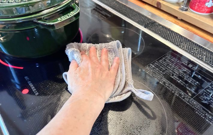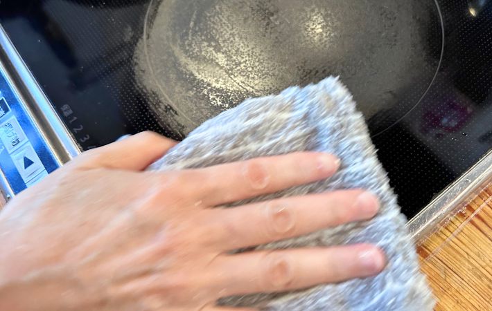 普段なら洗剤を使わないと落ちにくい油汚れも、サッと濡らして拭くだけでしっかりキレイに落とせます。