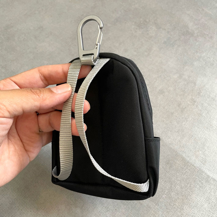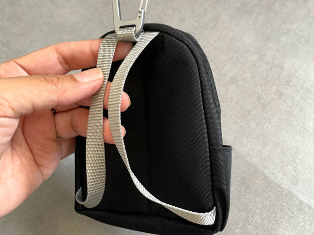 さらにカラビナつきなので、バッグのハンドルやベルトループ、リュックのジップ部分など、どこにでも簡単に取りつけられます。