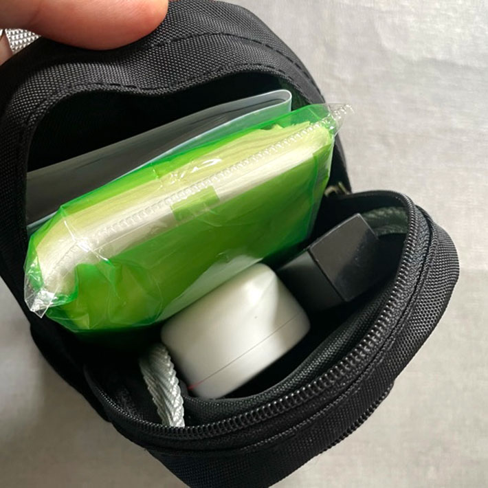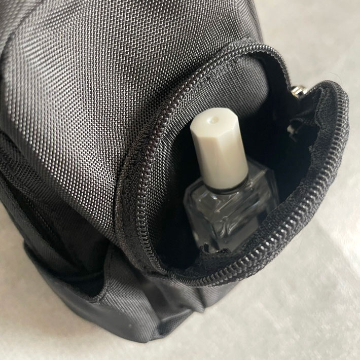 外側の小さいポケットも、目薬などを入れるのにちょうどいいサイズ感。