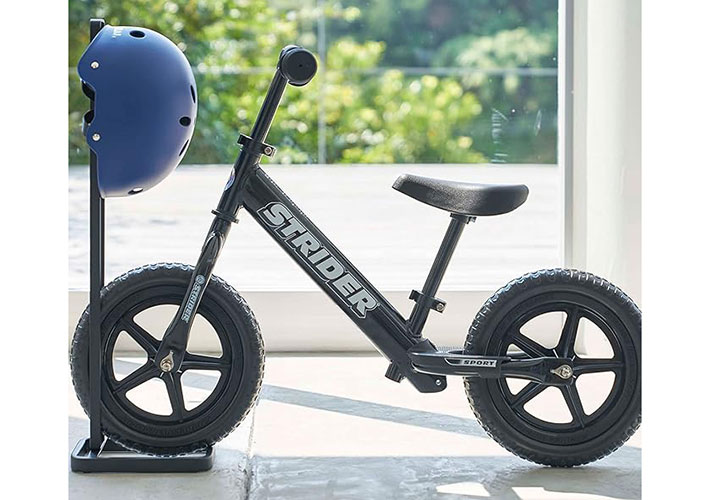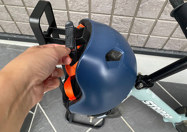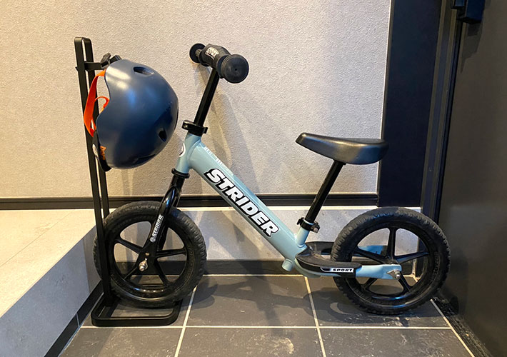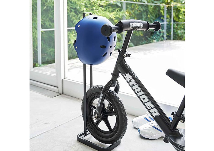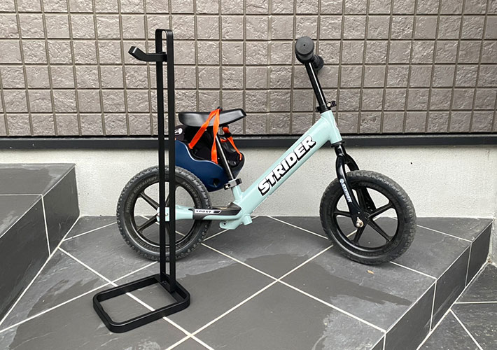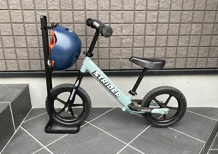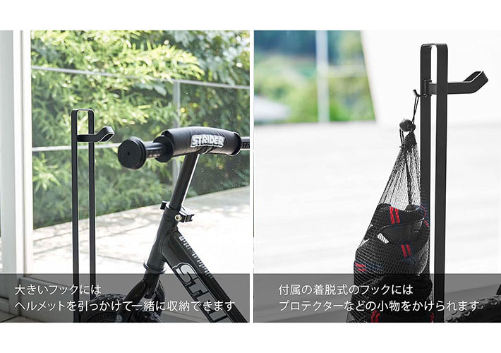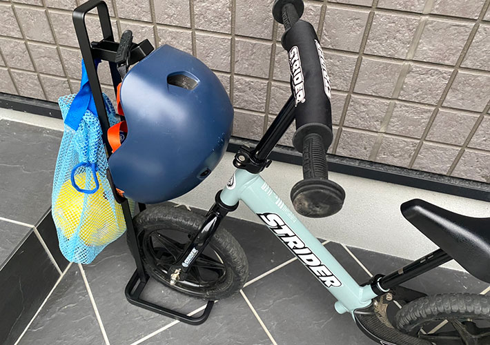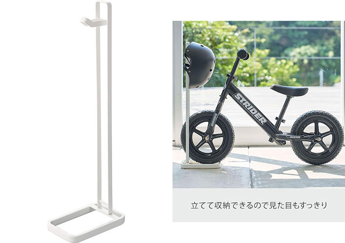 その名の通り、キッズバイクのようなペダルなし自転車をすっきり収納できるスタンドで、一緒にヘルメットなどの付属品もかけられるという優れもの。