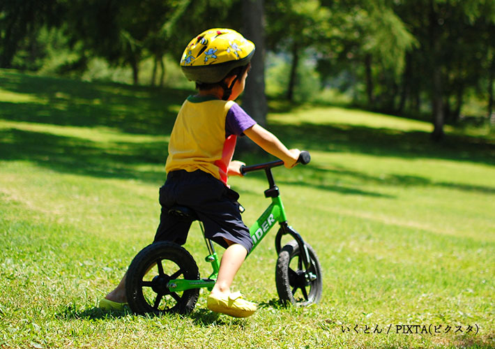 キッズバイクは、ペダルをこぐ代わりに、足で地面をキックして前に進む『プレ自転車』のような乗り物で、我が家の保育園児たちも愛用しています。