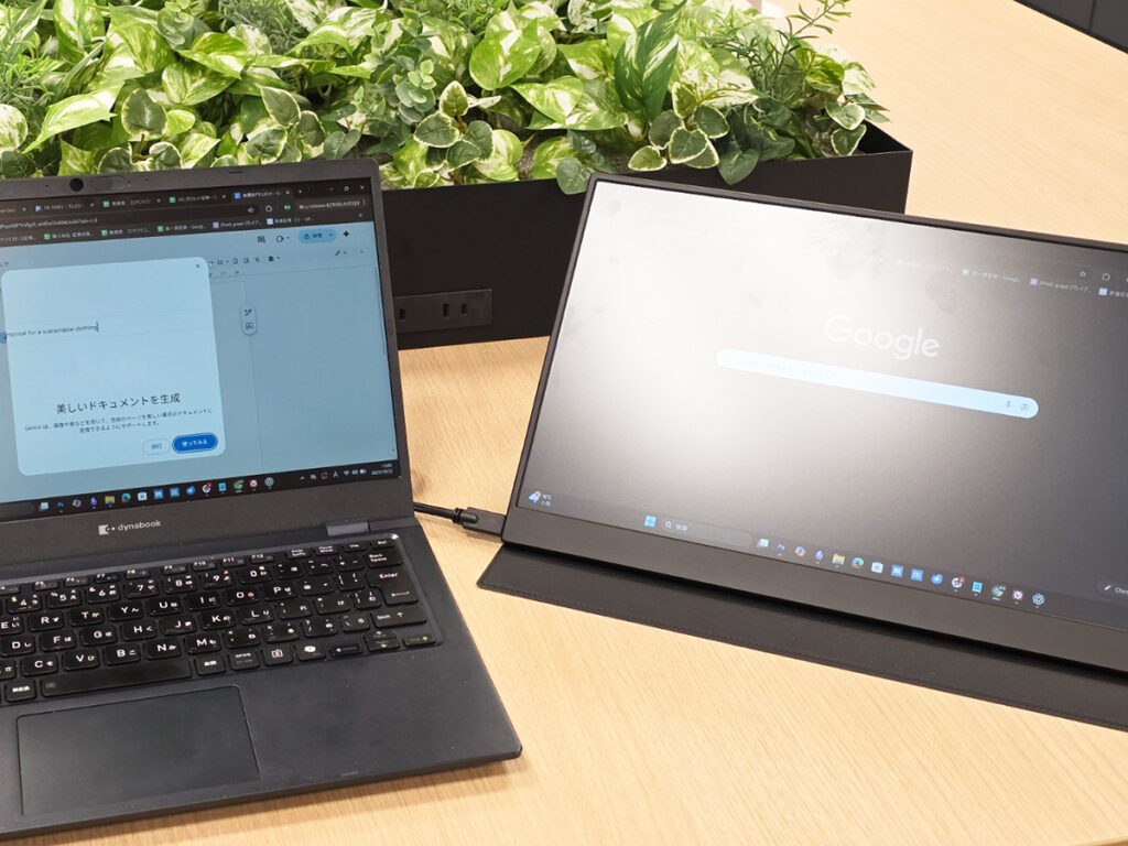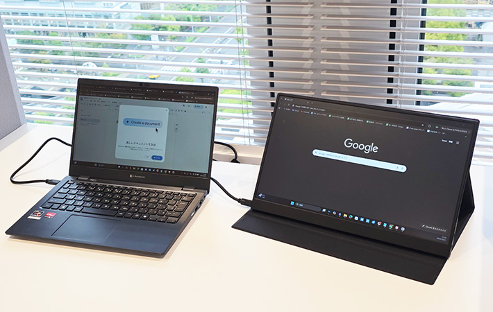 自宅やオフィスはもちろん、外出先でも気軽にデュアルモニター環境を構築できます。