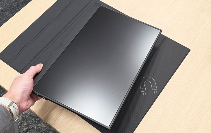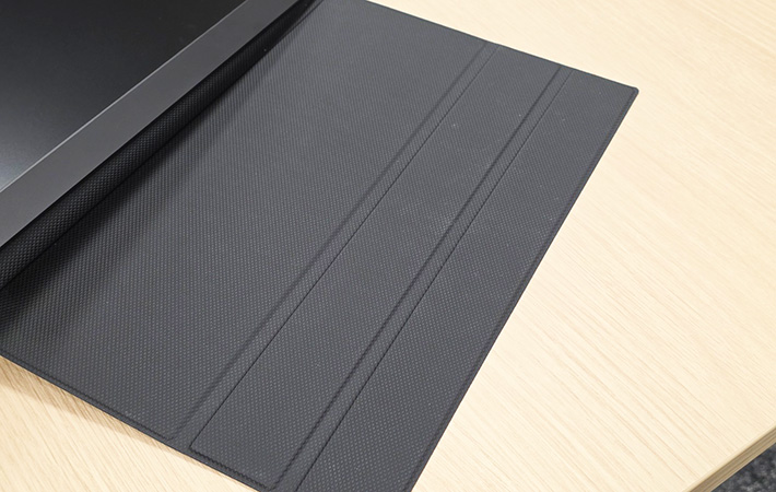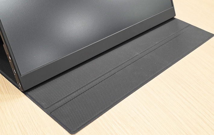 ケースは、そのままモバイルモニターを使う時のスタンドにもなる設計。内側に用意されている溝を活用すると、角度を調節しながら使用できます。