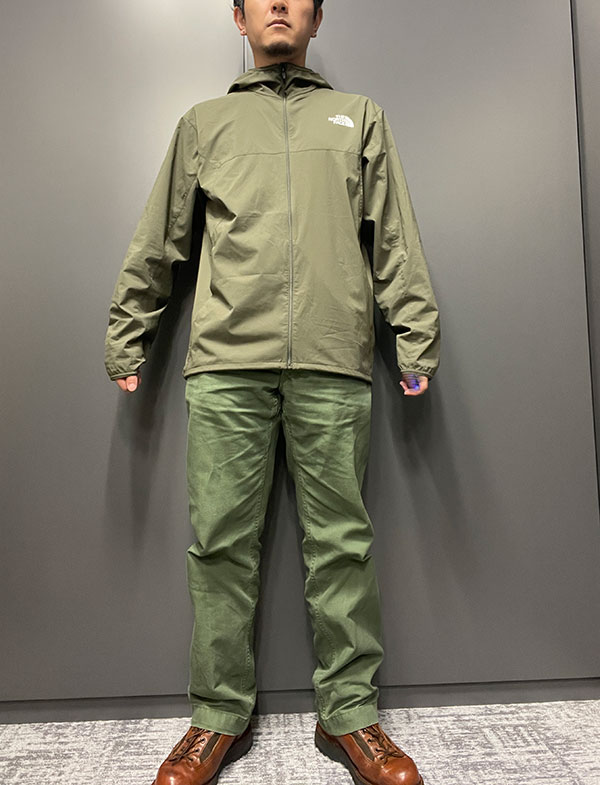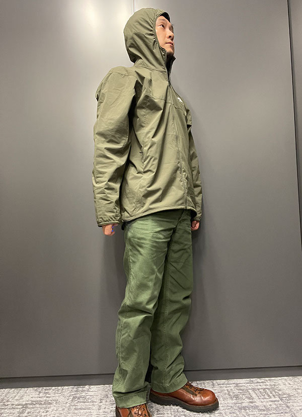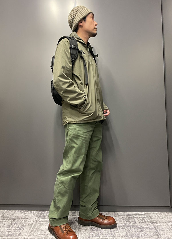 いかにもアウトドアファッションという見た目になりましたが、ジャケット自体はシンプルなので、ボトムスなどとの相性をあまり気にしなくていいのもラクチンですね。