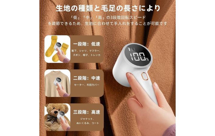 刃の回転スピードを三段階で調整することが可能で、薄手の靴下やニットから厚手のセーター、布団カバーまで素材に合わせて使い分けられます。