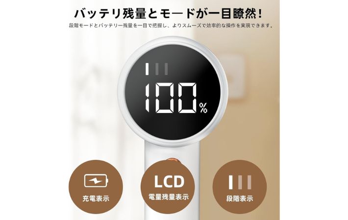 操作もスイッチ1つで分かりやすく、段階モードやバッテリー残量をひと目で確認できる大画面のLED液晶ディスプレイを搭載。