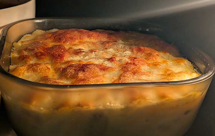 グラタンの材料を容器に満たし、チーズをたっぷりと乗せたら200℃のオーブンで焼くこと13分。