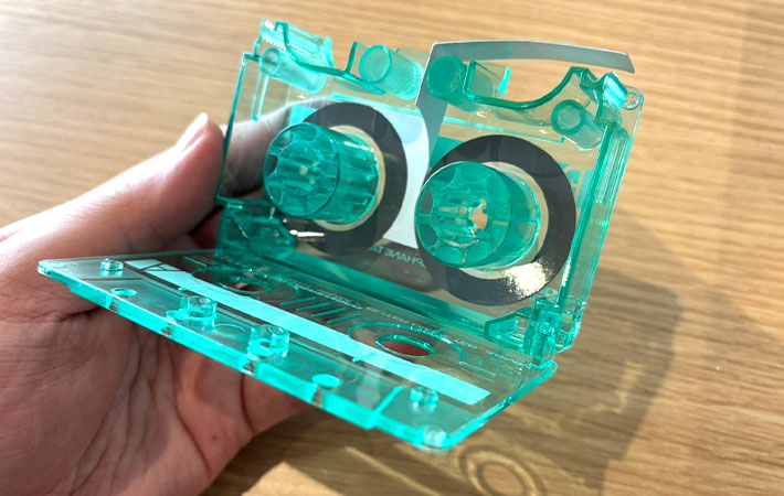 カセットテープ型のデザインにクリアカラーと、1990年前後によく音楽を聴いていた人ならつい視線を奪われてしまうのではないでしょうか。
