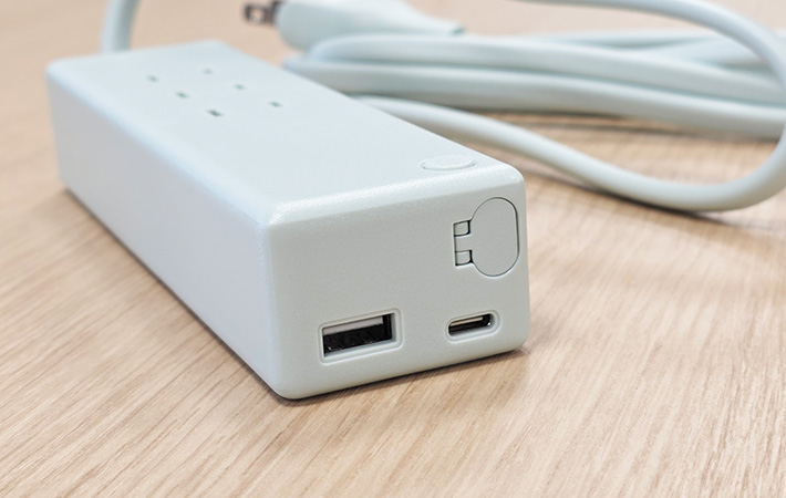 側面には、コンセントの差し込み口とは別に、USB Type-CとType-Aが各1ポートずつ用意されています。