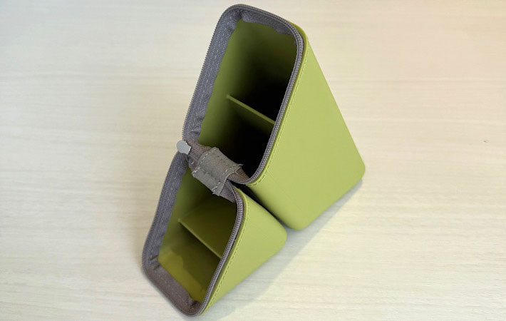 このペンケースの最大の特徴は、ファスナーを開けると自立するという点。