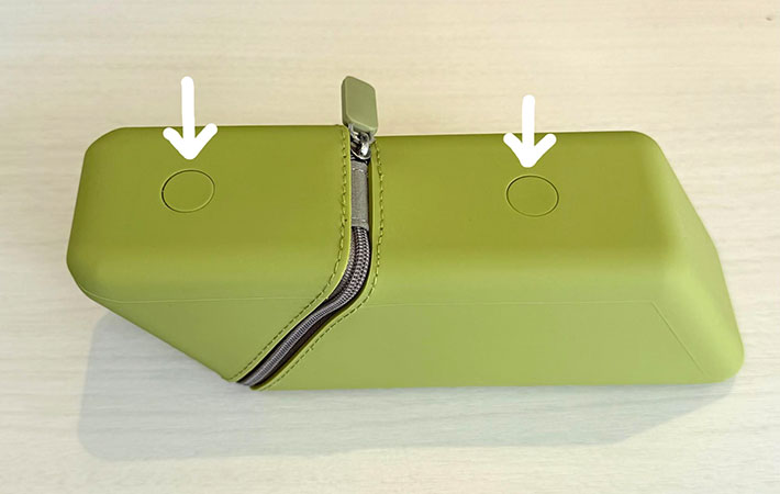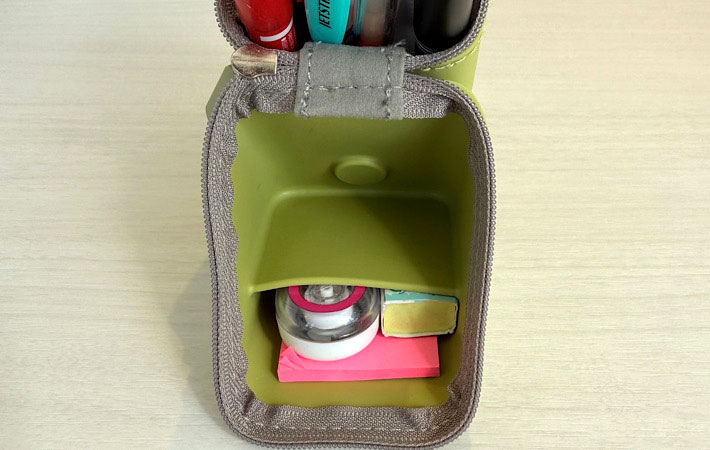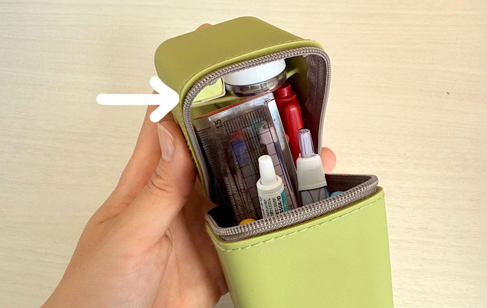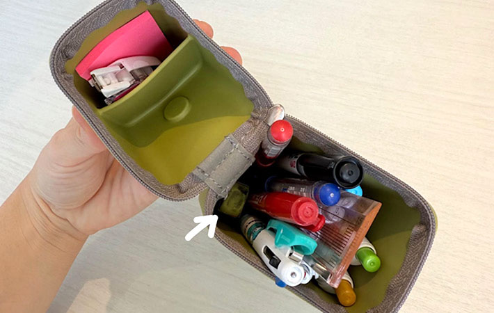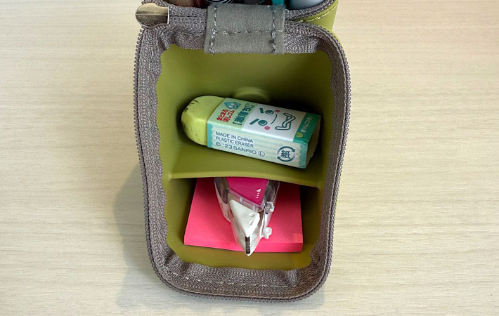 ファスナーを閉じると、下部の収納スペースに入れた消しゴムや付箋が上部の収納スペース側に移動してしまうのです。